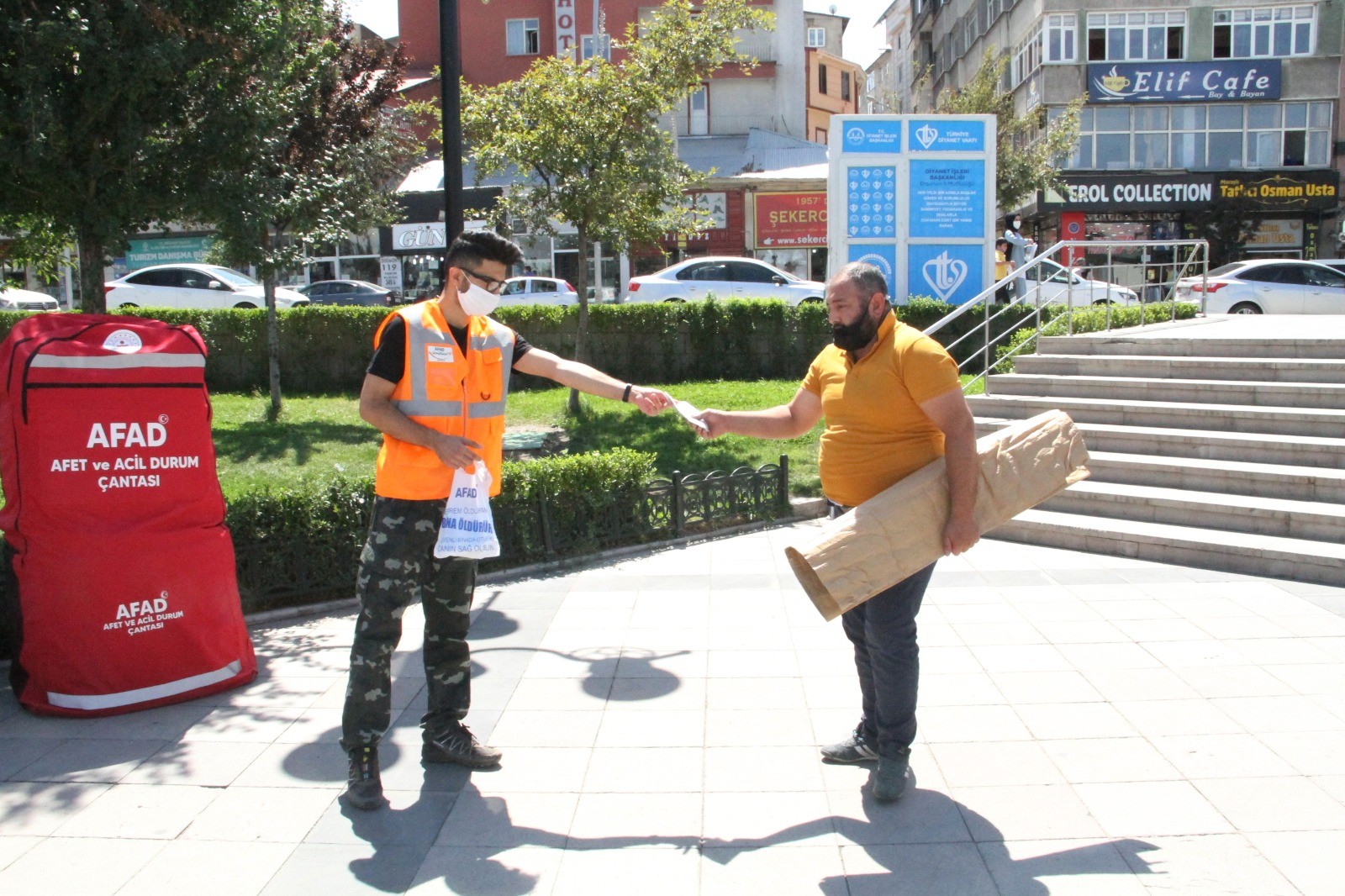 Cuma namazını kılmak üzere kent meydanlarına akın eden binlerce vatandaşa AFAD ekipleri maske dağıttı.