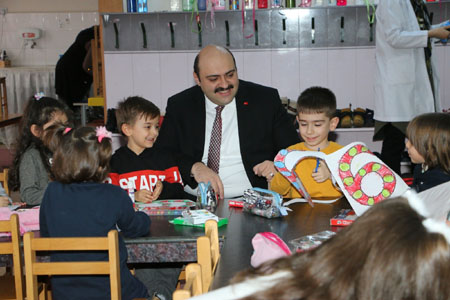 0-6 yaş grubu çocukların eğitim gördüğü anaokulunda çocukların Başkan Orhan’a ilgisi dikkatlerden kaçmadı. Beraberinde Aziziye İlçe Milli Eğitim müdürü Nurullah Yavilioğlu ile yaptığı ziyarette çocuklarla birlikte oyunlar oynayan Başkan Orhan, çocuklar gibi şendi. Anaokulu hakkında bilgi alan Başkan Orhan, geleceğin nesli çocukların ilk eğitimini aldıkları bu okulların önemine değindi. Anne ve babadan sonda en elzem olarak görülen anaokulu eğitimi ile çocukların geleceğinin şekillendiğine dikkat çeken Başkan Orhan, “Okul öncesi eğitim süresince çocuklar ilköğretime hazırlanırken, paylaşmayı, dayanışmayı, sosyalleşmeyi ve birlikte çalışmayı öğrenirler. Okul öncesi eğitimin amacı çocuklarda öğrenmeye ilgi uyandırmak ve çocuğun var olan yeteneklerini görünür kılmaktır. Yetişen çocuklar, daha hızlı ve başarılı bir gelişim gösterirler. Eğitimin ilk basamağını oluşturan okul öncesi eğitim gömleğin ilk düğmesidir ve bunun doğru iliklenmesi gerekir” dedi.