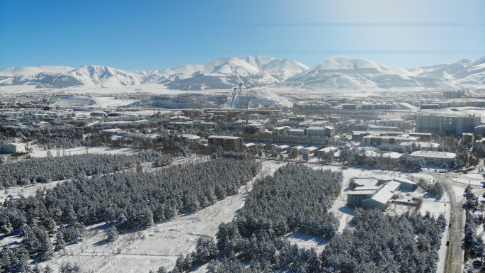 Erzurum’da kar yağışı sonrası oluşan manzara, dronla görüntülendi. Ağaçların üzerini kaplayan ve kenti beyaza bürüyen kar, kartpostallık görüntüler ortaya çıkarttı.