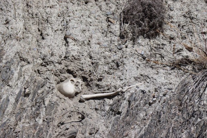 Erzurum’un Oltu ilçesinde yol kenarında yol kenarında toprağa gömülü insan kemikleri dikkat çekiyor.