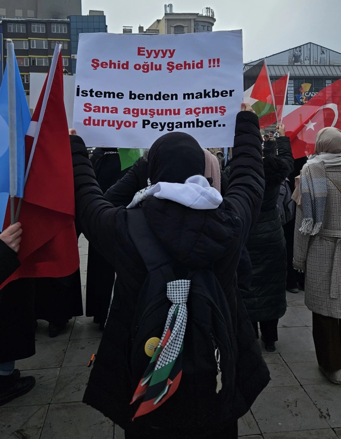 Sessiz yürüyüşün ardından grup adına açıklamalarda bulunan Aile hekimi Bünyamin Yeşilyurt, ‘Umutlarını hiç kaybetmeyenler kazandı. Gözleri yaşlı şekilde ‘Elhamdülillah’ diyen çocuklar kazandı. Evlatlarını feda eden anneler kazandı. Gazze’de artık bomba sesleri değil zafer nidaları yankılanıyor. Siyonizm; tarihin en büyük yenilgisini yaşıyor. Bir sabah geldi kardan aydınlık ve daha niceleri gelecek inşallah. Önce Şam’ın zaferi şimdi Gazze zaferi… Rabbim Gazze’nin ve Batı Şeria’nın İsrail’den tamamen kurtulduğu, Mescid-i Aksa’nın özgür olduğu günleri de görmeyi nasip etsin bize. Doğu Türkistanlı kardeşlerimizin Çin zulmünden kurtulduğu gün de birlikte sevinelim inşallah. Bizler tarihin en iyi ispat edilebilen, en çok şahidi bulunan soykırımının tanıklarıyız. İsrail terör devletinin işgali ve zulmü bitmedi, bu sebeple meydanı boş bırakmıyoruz. 62 haftadır her cumartesi buradaydık, şimdi de alacağımız dersleri konuşmak için 63.kez buradayız. Evet! İsrail, Gazze halkının destansı direnişi karşısında yenildi. Tam donanımlı askerleri, bir avuç yetimden oluşan Hamas mücahitlerinin yiğitliği karşısında ezildi. Son teknoloji silahlara sahip olmalarına, dünyanın en büyük güçlerini arkalarına almalarına, Amerika’nın ve Avrupa’nın gönderdiği son model savaş uçaklarıyla ve envaı çeşit bombalarıyla desteklenmelerine rağmen; soba borusundan yaptıkları füzeleri olan Allah’ın Arslanlarına karşı koyamadılar. Bir kez daha gördük ki Allah’ın yardımıyla kuşlar filleri yener; Allah’ın yardımıyla Nemrut’un değil karıncanın dediği olur Allah’ın yardımıyla 1 taşla koca Calut devrilir’ diye konuştu.