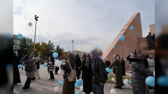 Atatürk Üniversitesi İlahiyat Fakültesi öğrencileri, gökyüzüne mavi beyaz balonlar bırakarak Doğu Türkistan'da yaşanan zulme dikkat çekti.