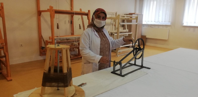 Erzurum Olgunlaşma Enstitüsü Müdiresi Fatma Taşbaşı, Olgunlaşma Enstitülerinin kaybolmaya yüz tutmuş el sanatlarını ve giyim kültürünü araştıran ve aslına uygun bir şekilde bunları üreten, modernize eden, gelecek nesillere aktaran, nitelikli eleman yetiştiren bir kurum olduğunu belirterek, “Erzurum, Kars, Ağrı, Iğdır, Ardahan ve Bayburt illeri ile birlikte kaybolmaya yüz tutmuş el sanatlarını araştırıyoruz. Ehram atölyesinde dokunan bu materyaller Erzurum ve Bayburt yörelerinde kadınların büründükleri bir örtünme aracıdır. Bu materyal tamamen koyun yününden elde edilir. Haziran ayında kırkılan koyunların yünlerinden alınan, daha çok hayvanın karın bölgesi tercih edilir, yünler kullanılır. Ehram dokuma ustalarımız haziran ayında temizlenecek yünleri aldılar, dere kenarlarında tokaçlama yöntemi ile yıkadılar. Ehram olarak kullanılacak yünün çok temiz olması gerek. Temizlenen yünler sonra tarama denilen taraklarla taranır, iplik bükme aracı bir adıyla da yöresel olarak teşi denen araçla ince iplik haline getirilir. İplik haline gelen yünler dokuma tezgahlarında ehram olarak işlemi yapılır” diye konuştu.