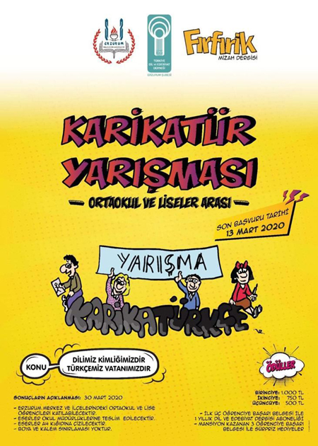 Milli Eğitim İl Müdürlüğü, Türkiye Dil ve Edebiyat Derneği ile Fırfırik Dergisi tarafından ortaklaşa düzenlenecek olan yarışmada dereceye giren öğrencilere para ödülü verilecek. Karikatür çiziminin yaygınlaşmasının yanı sıra Türkçe’nin kullanımının hedef alındığı yarışmanın son başvuru tarihi 13 Mart 2020 olarak belirlendi. Yarışmaya katılan öğrencilerin yaptığı eserlerin değerlendirme açıklaması 30 Mart tarihinde yapılacak ve bir hafta sonra da ödül dağıtımı yapılacak.