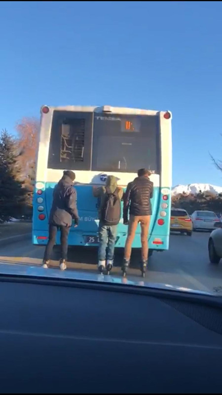 Araçların arkasına tutunarak kazaya davetiye çıkaran gençlere sürücüler de tepki gösteriyor. Üniversite Kavşağı’nda trafiğin yoğun olduğu saatlerde trafikte seyreden belediye otobüsü arkasına tutunarak kayan patenli 3 gencin kazaya adeta davetiye çıkardığı görüldü. Gençler, hareket halindeki otobüse tutunarak dakikalarca patenle ilerledi.