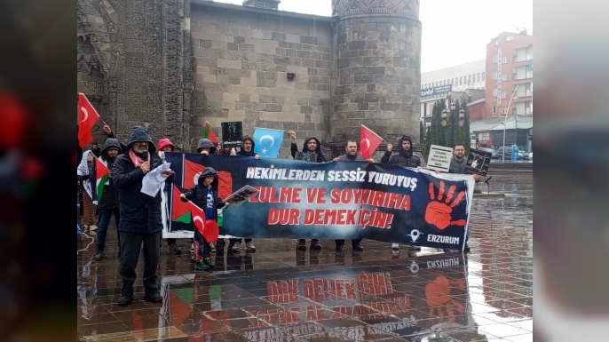 Erzurum’da hekimler, sağlık çalışanları ve çok sayıda vatandaş, sağanak yağışa aldırış etmeden Yakutiye Kent Meydanı’nda bir araya gelerek Gazze’de yaşananlara dikkat çekti. Sessiz yürüyüşün ardından yapılan açıklamada, uluslararası kamuoyuna çağrı yapılırken, insani yardım koridorlarının açılması ve boykotun güçlendirilmesi gerektiği vurgulandı.