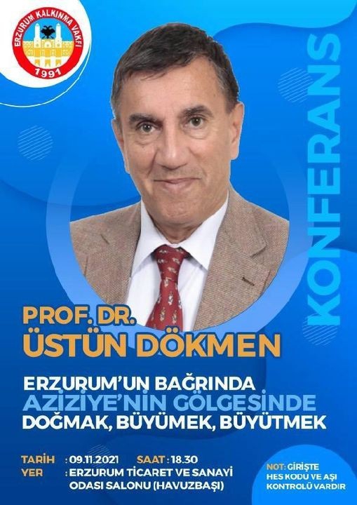 Ankara Üniversitesi Eğitim Bilimleri Fakültesi öğretim üyesi olan Prof. Dr. Üstün Dökmen, 9 Kasım günü kısa adı ERVAK olan Erzurum Kalkınma Vakfı’nın konuğu olacak. Aynı gün Ticaret ve Sanayi Odası (ETSO) salonunda saat 18.30’da sahneye çıkacak olan Prof. Dr. Dökmen, ‘Erzurum’un bağrında, Aziziye’nin gölgesinde, doğmak, büyümek, büyütmek’ konusunu işleyecek. Konferansı izlemek için 9 Kasım Salı günü akşamı ETSO’ya gidecek vatandaşlardan sadece HES kodu istenecek.