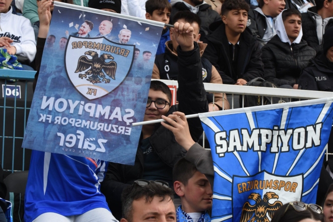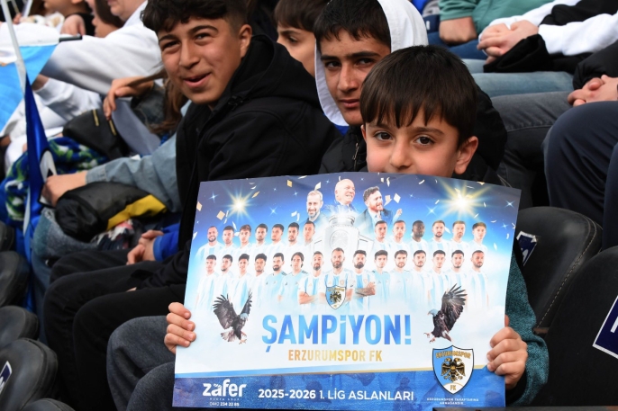 Kazım Karabekir Stadyumu’nda oynanan Erzurumspor–Bandırmaspor karşılaşması öncesinde Zafer Medya’nın dağıttığı bayrak ve posterler, tribünlerde adeta bayram havası estirdi. Mavi-beyaz renklere bürünen stadyumda taraftarlar, şampiyonluğun coşkusunu doyasıya yaşadı.